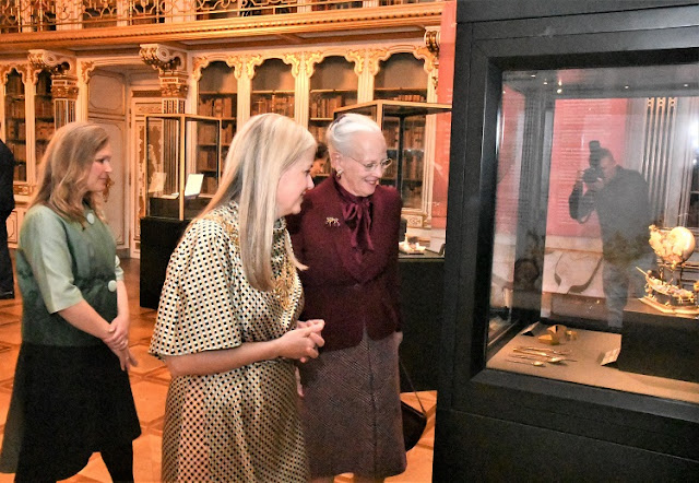 Photo Hasse Ferrold: H.M.The Queen looking at Jewelery Exhibit at Chr.Borg Castle at earlier event.